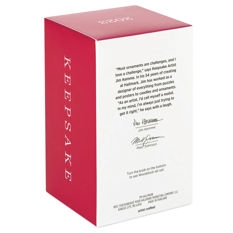 - Key Features: Turn the knob on the bottom to see Woodstock set sail.